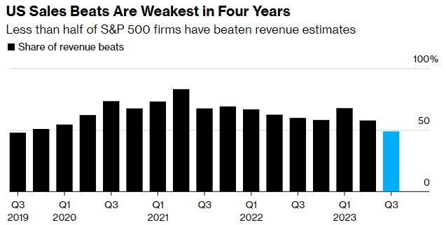 美国企业在本财报季发布了四年来最惨淡的季度销售,这一迹象表明,日益疲软的消费者需求正在限制企业进一步提价的能力。根据数据,超过80%的标普500指数公司已经公布了财报,但不到一半的公司第三季度的收入超过了预期,这是自2019年同期以来的最低比例。德意志银行集团策略师表示,全球销售增长速度也已放缓至“疫情前区间的低端”。