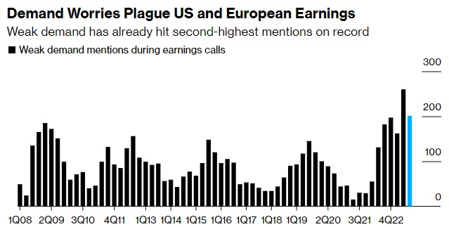 策略师们表示,企业似乎对各自业务需求的整体前景变得更加谨慎。他们认为,企业信心的减弱反映在本季度利润预警大幅上升的趋势上。对财报电话会议记录的分析显示,“需求疲弱”是美国和欧洲最热门的短语之一。据2000年以来的数据显示,目前仍有20%的公司未公布业绩,对“需求疲软”的讨论热度已经是有记录以来的第二高水平。如果未来几周的提及速度保持不变,这将是有记录以来的最高纪录。