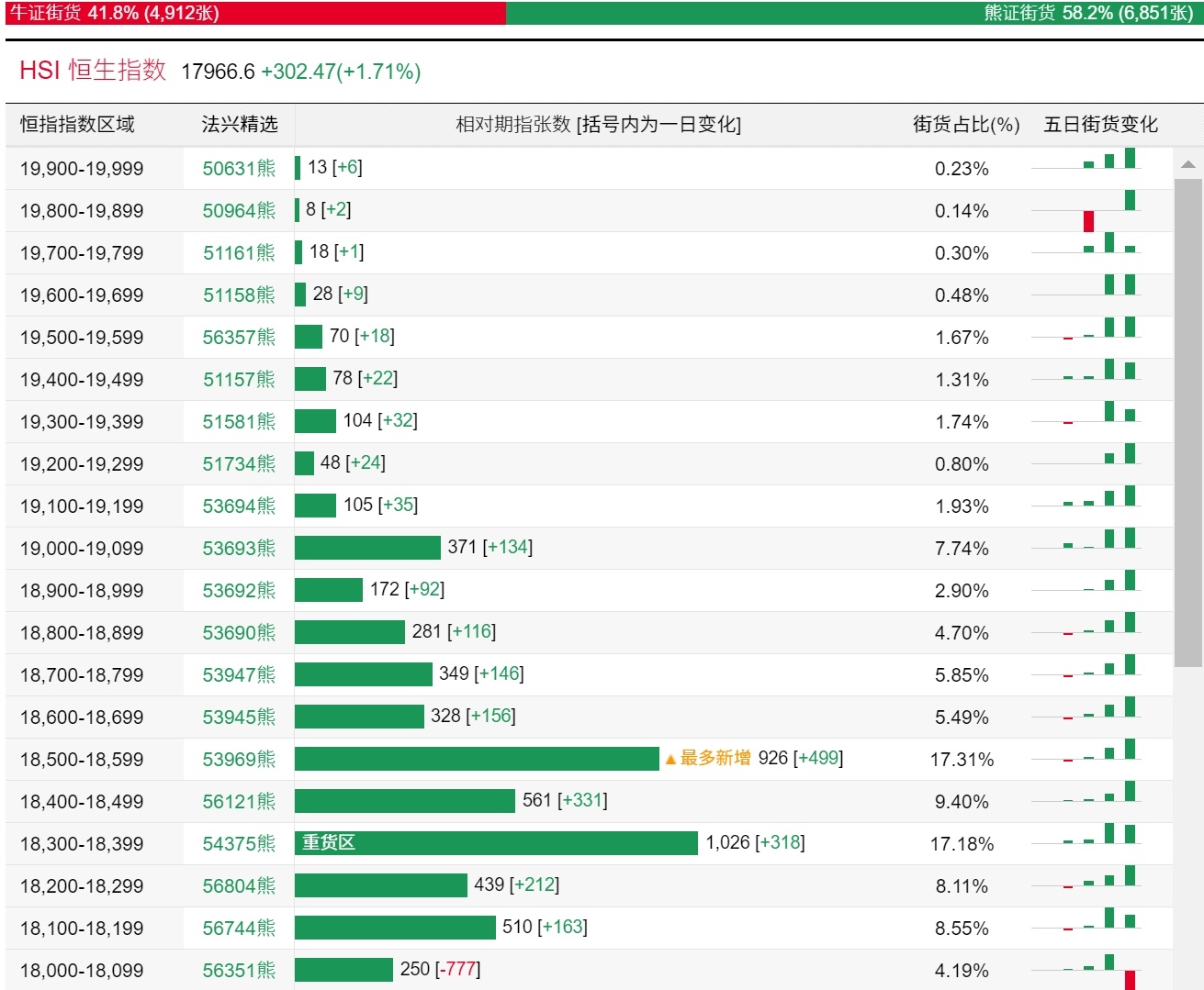 法兴恒指牛熊证街货分布图中的数据显示,熊证街货重货区在18300-18399区间,该区间最新熊证数量为1026张,较上一交易日增加318张;最多新增在18500-18599区间,该区间最新熊证数量为926张,较上一交易日增加499张。