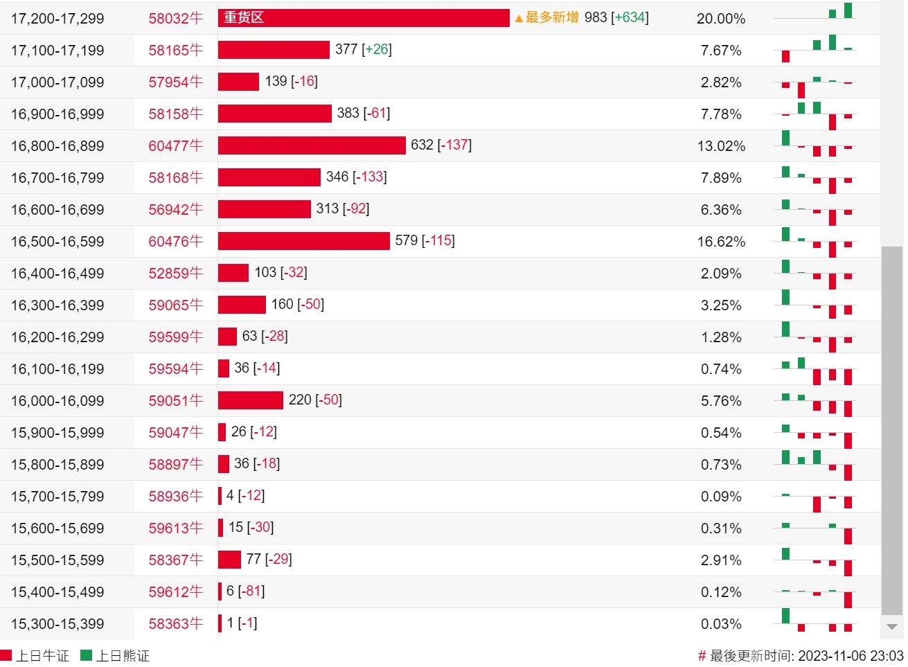 牛证街货重货区和最多新增都在17200-17299区间,该区间最新牛证数量为983张,较上一交易日增加634张。