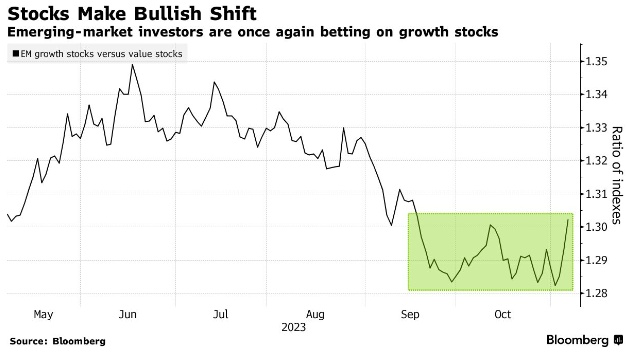 在最近的反弹之前,新兴市场股票遭受了2.6万亿美元的抛售,投资者担心美国的利率将在更长时间内保持较高水平。亚洲经济放缓和地缘政治紧张局势加剧进一步恶化了市场情绪。在这种情况下,价值型股票延续了其优异表现,相对于成长型股票上涨至近四年来的最高水平。
