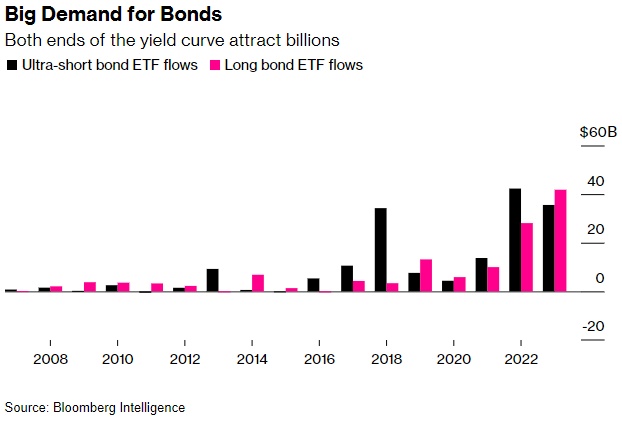 智通财经APP注意到,今年,创纪录的大量现金涌入美国国债收益率曲线的两端,要么寻求抓住20多年来最高的短期利息支付,要么寻求在利率最终见顶后从长期债券的反弹中获利。不同的赌注似乎都将同时获得回报。
