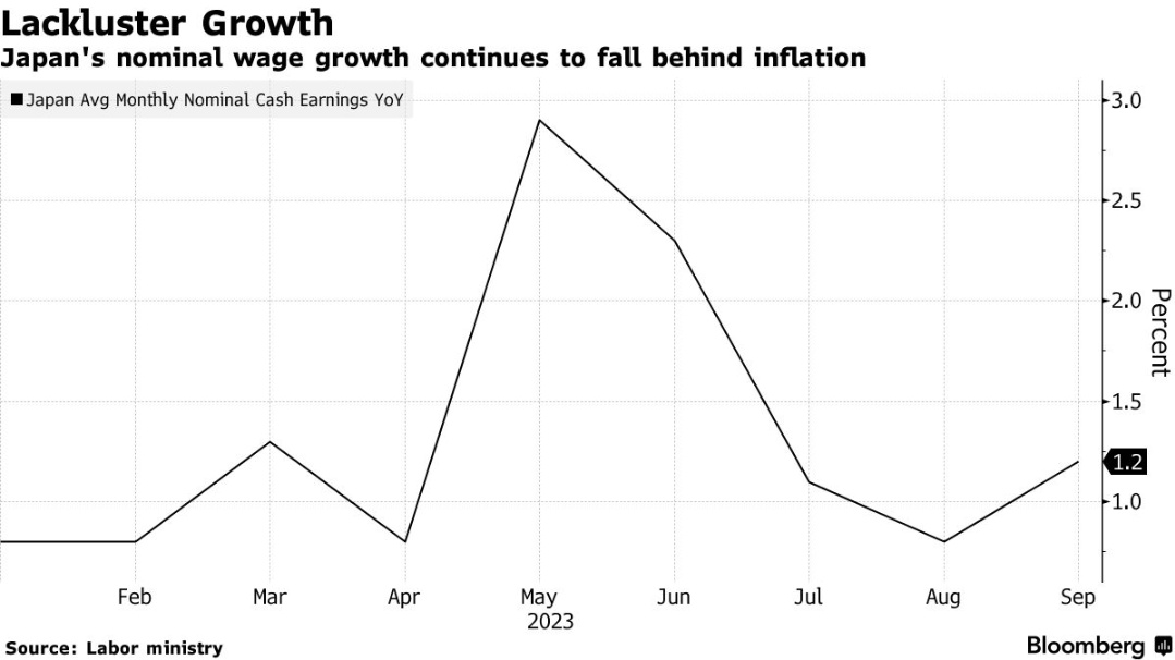 由于物价上涨仍强于日本央行最初的假设,实际现金收益同比下滑2.4%。东京的通胀在10月再次升温,突显出物价持续上涨的压力。