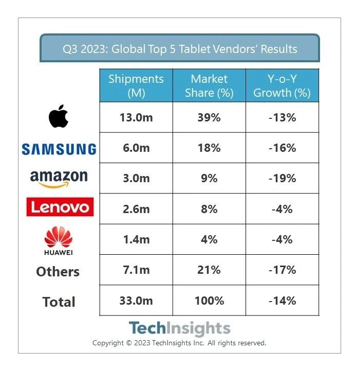 智通财经APP获悉,TechInsights近期发布的研究报告指出,尽管由于疫情后需求的残留和全球主要市场持续的经济挑战,全球平板电脑市场规模仍在下滑,但2023年Q3,全球平板电脑市场出货量同比下降14%是今年目前为止最好的市场表现。与去年相比,所有领先的平板电脑厂商的业绩都有所下降,但大多数厂商表现都超过了总体市场。