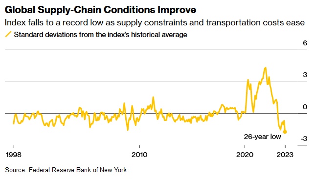 据悉,该指标处于0代表历史平均值,任何方向的变化都标志着与该趋势的标准差。该指标汇集了27个变量,涵盖了从跨境运输成本到各个国家/地区的国家级制造业数据等方方面面。该指标已连续9个月处于负值区域。通过铁路、卡车、海运和空运运输货物的成本已从疫情期间创下的历史新高下降。
