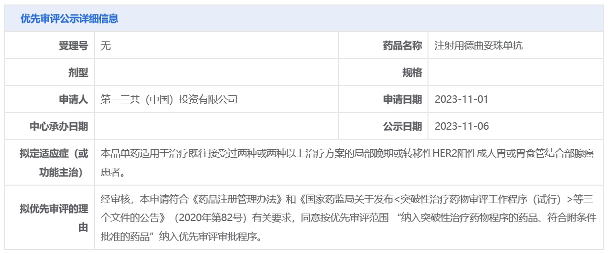 智通财经APP获悉,11月6日,中国国家药监局药品审评中心(CDE)官网公示,第一三共(Daiichi Sankyo)申请的注射用德曲妥珠单抗新适应症拟纳入优先审评,单药适用于治疗既往接受过两种或两种以上治疗方案的局部晚期或转移性HER2阳性成人胃或胃食管结合部腺癌患者。公开资料显示,德曲妥珠单抗(Enhertu)是阿斯利康(AstraZeneca)(AZN.US)和第一三共联合开发的一款靶向HER2的抗体偶联药物(ADC),此前已在中国获批治疗HER2阳性和HER2低表达成人乳腺癌患者。