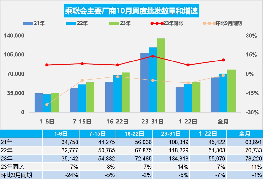 初步统计:10月1-31日,全国乘用车厂商批发242.5万辆,同比增长11%,环比下降1%。今年以来累计批发2,024.1万辆,同比增长7%。