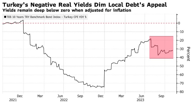 这个亚洲以外的全球第五大发展中经济体可能面临数十亿美元的债券资金流入。自去年6月以来,土耳其央行的基准利率已经翻了两倍多,达到35%,Amundi和Itau Asset Management等公司希望进一步加息5-10个百分点,一些经济学家预计本季度将达到这一水平。