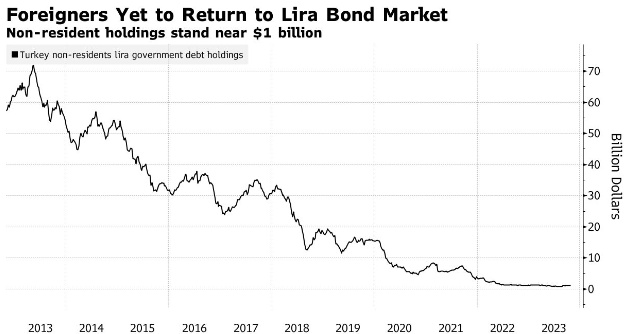 自5月份埃尔多安再次当选后,土耳其转向更传统的政策以来,土耳其的基准10年期债券利率飙升了20多个百分点,达到30%左右的历史最高水平。但即使在新兴市场以本币计价的债券收益率已跌至接近美国国债水平的情况下,土耳其的回报仍不足以让大多数投资者看涨。非居民持有的土耳其国债仍仅为10亿美元,远低于10年前逾700亿美元的峰值。