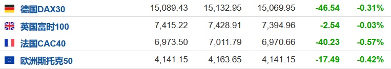 2.截至发稿,德国DAX指数跌0.31%,英国富时100指数跌0.03%,法国CAC40指数跌0.57%,欧洲斯托克50指数跌0.42%。