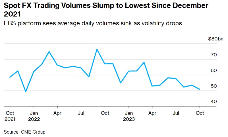 外汇市场一直在区间波动,彭博美元指数10月份在2%的区间内波动,因为有迹象表明,美联储计划在一轮激进的货币紧缩之后保持利率稳定。追踪主要货币汇率一个月隐含波动率的指数接近2022年2月以来的最低水平。