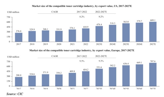 在经济前景不明朗的背景下,多数公司更倾向于性价比更高的兼容性碳粉盒,而不是原品牌碳粉盒,这让兼容性碳粉盒行业的未来进一步明朗。据CIC数据显示,从2022至2027年,以出口价值计算,美国兼容性碳粉盒的市场规模的年复合增速为8.2%,同期的欧洲市场的年复合增速为9.3%。