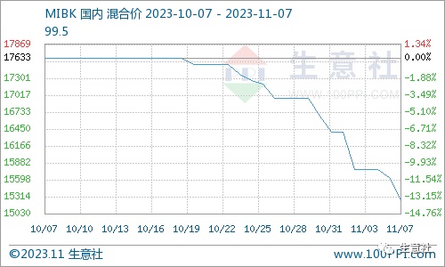 智通财经APP获悉,据生意社商品行情分析系统,近期国内MIBK市场重心下行。11月1日MIBK市场报盘在16400元/吨,11月7日市场报盘在15266元/吨,下跌6.91%。生意社表示,隔夜原油宽幅走跌,产业链上游利空增加,且国内需求难言乐观,生意社预计,短期MIBK市场继续探底,贸易商让利降库存为主,重点关注原料端支撑情况。