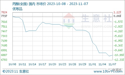 成本面利空,进入11月份原油方面跌多涨少,原料丙酮市场行情以跌势为主,进口货源和国内供应充足,市场现货流通量增加,加之月初下游大工厂主要消耗合约量为主,入市补货量较少,截止7日华东地区丙酮报盘价格在6600元/吨。