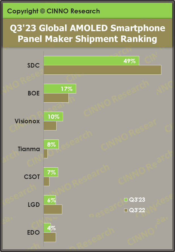 三星显示(SDC)AMOLED智能手机面板出货量同比增长5.2%,市场份额由去年同期的60.1%缩窄至48.8%,市场份额同比下滑11.3个百分点,三星显示在中国市场的出货量持续锐减;