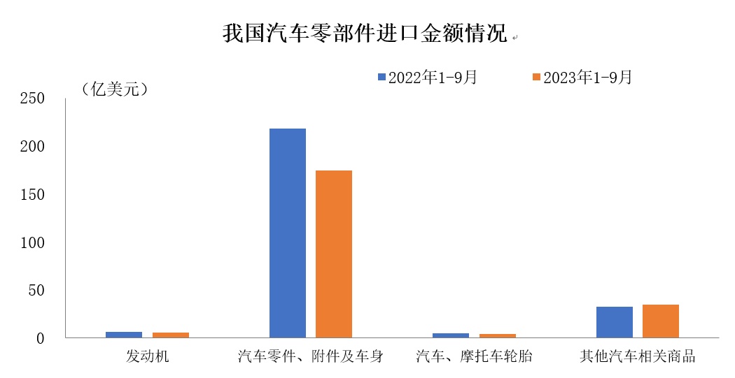 2023年1-9月,在汽车零部件主要品种中,与上年同期相比,其他汽车相关产品进口金额小幅增长,其他三大类汽车零部件品种进口金额均呈较快下降。