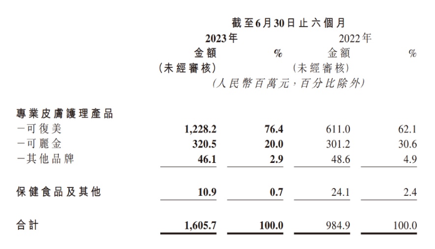 从招股书数据、2022年年报和2023年半年报数据来看,2022年,可复美、可丽金分别实现收入16.13亿元、6.18亿元,同比增长分别达到79.62%、17.71%。而根据巨子生物上市时招股书披露的数据,2019-2022年,可丽金总收入仅增长了28.48%,可复美增长了456.21%。但到今年上半年,可复美收入在实现同比增长100.98%的同时,可丽金收入同比增幅仅有6.64%。