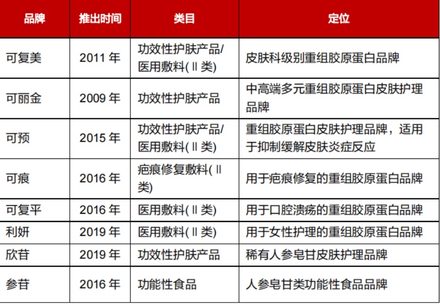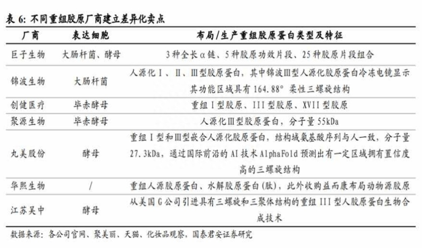 然而随着各家头部企业在重组胶原蛋白领域的投入增加,不同的厂商开始在该领域建立起差异化卖点。目前重组胶原蛋白赛道上除巨子生物外,目前在国内已产业化该技术的企业还包括锦波生物、创健医疗、聚源生物、丸美股份及江苏吴中等。