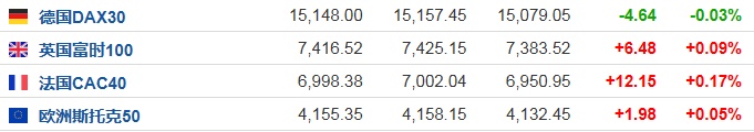 2.截至发稿,德国DAX指数跌0.03%,英国富时100指数涨0.09%,法国CAC40指数涨0.17%,欧洲斯托克50指数涨0.05%。