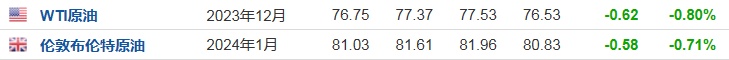 3. 截至发稿,WTI原油跌0.80%,报76.75美元/桶。布伦特原油跌0.71%,报81.03美元/桶。