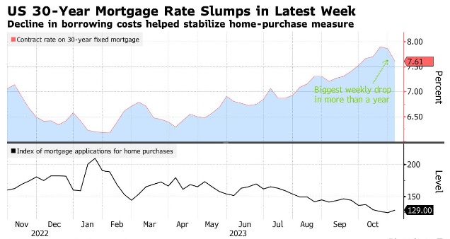 智通财经获悉,美国30年期抵押贷款平均利率上周创下一年多来最大跌幅,帮助推动购房申请出现6月初以来最大增幅。美国抵押贷款银行家协会(MBA)的数据显示,30年期固定抵押贷款合约利率下滑25个基点,至7.61%,为9月底以来的最低水平。同时,周三公布的数据显示,截至11月3日当周,该协会住房抵押贷款申请指数上升了3%。