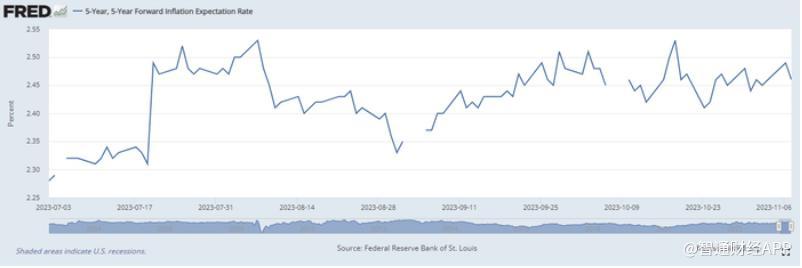 纽约FHN Financial的宏观策略师Will Compernolle指出,与接近2.5%的水平本身相比,更令人担忧的是,5年远期通胀预期率在7月中旬左右开始走高约20个基点,在没有任何重大新闻的情况下,对未来的通胀预期不断走高,这可能是一个问题。