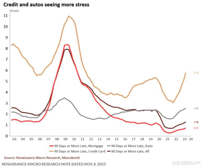 Dutta表示,逾期还款至少90天的汽车贷款余额比例跃升至2.53%。这是自 2010 年第三季度以来的最高值,而逾期还款至少90天的信用卡余额则增至5.78%。