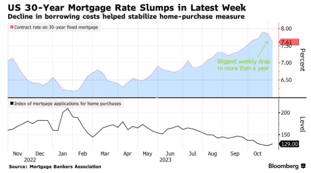 连续第二周的下跌进一步拉低了购房借款成本,使其从10月份触及的近8%的20年高点回落,当时10年期美国国债收益率(美国住房贷款利率的基准)一直在走高。