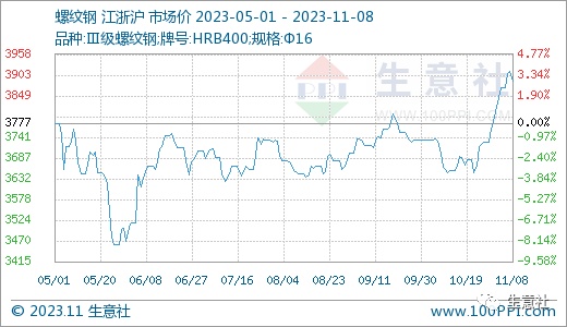智通财经APP获悉,11月9日,据生意社商品行情分析系统,螺纹钢现货价格自10月底以来触底反弹,创下近半年新高。截止11月8日,螺纹钢价格3912.89元/吨,较10月23日低点反弹7.22%,较5月26日年内低点上涨13.05%。“金九银十”传统旺季下,螺纹钢表现并不抢眼,一直低位箱体震荡为主,直到10月底,多重利好因素推动下,螺纹钢开始触底反弹,创下阶段性新高。