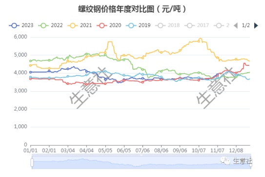 通过螺纹钢的年度价格对比图来看,近几年来,11月份螺纹钢价格涨跌参半,没有明显的淡季效应。