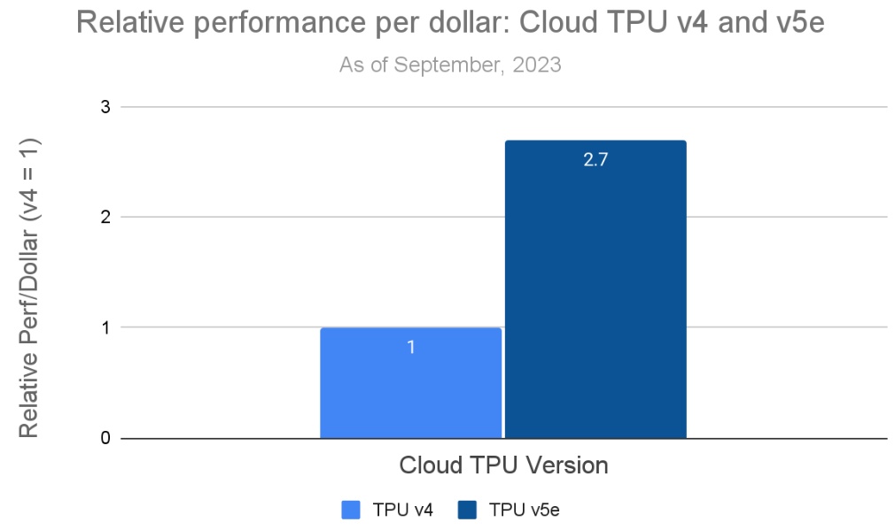 与Cloud TPU v4相比,TPU v5e可为大语言模型和生成式AI模型提供每美元花费中高达2倍的训练性能和2.5倍的推理性能。Cloud TPU v5e的成本不到TPU v4的一半,但可以让更多企业训练和部署更大、更复杂的AI模型。总体来看,与TPU v4相比,TPU v5e每美元的性能提高了2.7倍。