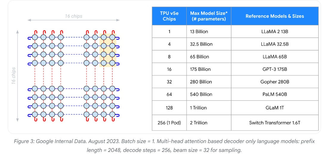 谷歌新一代TPU芯片——Cloud TPU v5e专为提供大中型训练与推理所需的成本效益和性能而设计。TPU v5e Pods能够平衡性能、灵活性和效率,允许多达256个芯片互连,聚合带宽超过400 Tb/s和100 petaOps的INT8性能,使对应的平台能够灵活支持一系列推理和训练要求。