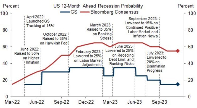 智通财经APP获悉,高盛对美国将避免经济衰退越来越有信心。高盛表示:“我们仍然认为美国经济衰退的风险有限,并重申美国经济衰退的可能性为15%。”“我们预计2024年全球经济增长将受到几个有利因素的推动,包括家庭实际收入增长强劲、货币和财政紧缩的拖累减小、制造业活动复苏、以及各大央行在经济增长放缓时削减保险支出的意愿增强。”