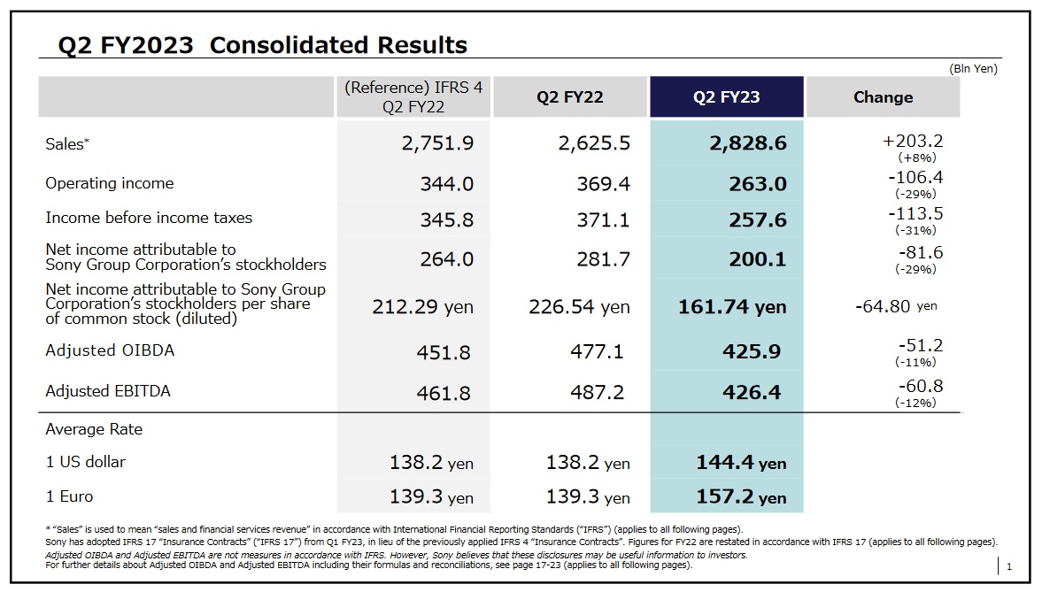 智通财经APP获悉,11月9日,索尼(SONY.US)公布了截至9月30日的2023财年第二财季业绩。财报显示,索尼Q2销售额为2.83万亿日元,同比增长8%;营业利润为2630亿日元,同比下降29%,不及市场预期的3025亿日元;归属于公司股东的净利润为2001亿日元,同比下降29%,同样不及市场预期的2267亿日元。