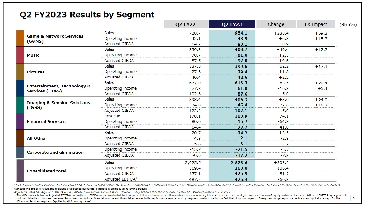 按业务划分,索尼游戏及网络服务业务(G&NS)销售额为9541亿日元,同比增长32%;音乐部门销售额为4087亿日元,同比增长14%;影视部门销售额为3996亿日元,同比增长18%;娱乐、技术及服务业务(ET&S)销售额为6135亿日元,同比下降9%;成像与传感解决方案业务(I&SS)销售额为4063亿日元,同比增长2%;金融服务营收为1039亿日元,同比下降42%。