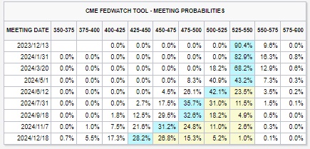 根据CME的美联储观察工具,期货市场目前预计美联储在12月会议上维持利率不变的可能性约为90%,高于一个月前的57.6%,并普遍预计美联储最早将在2024年5月或6月开始降息。