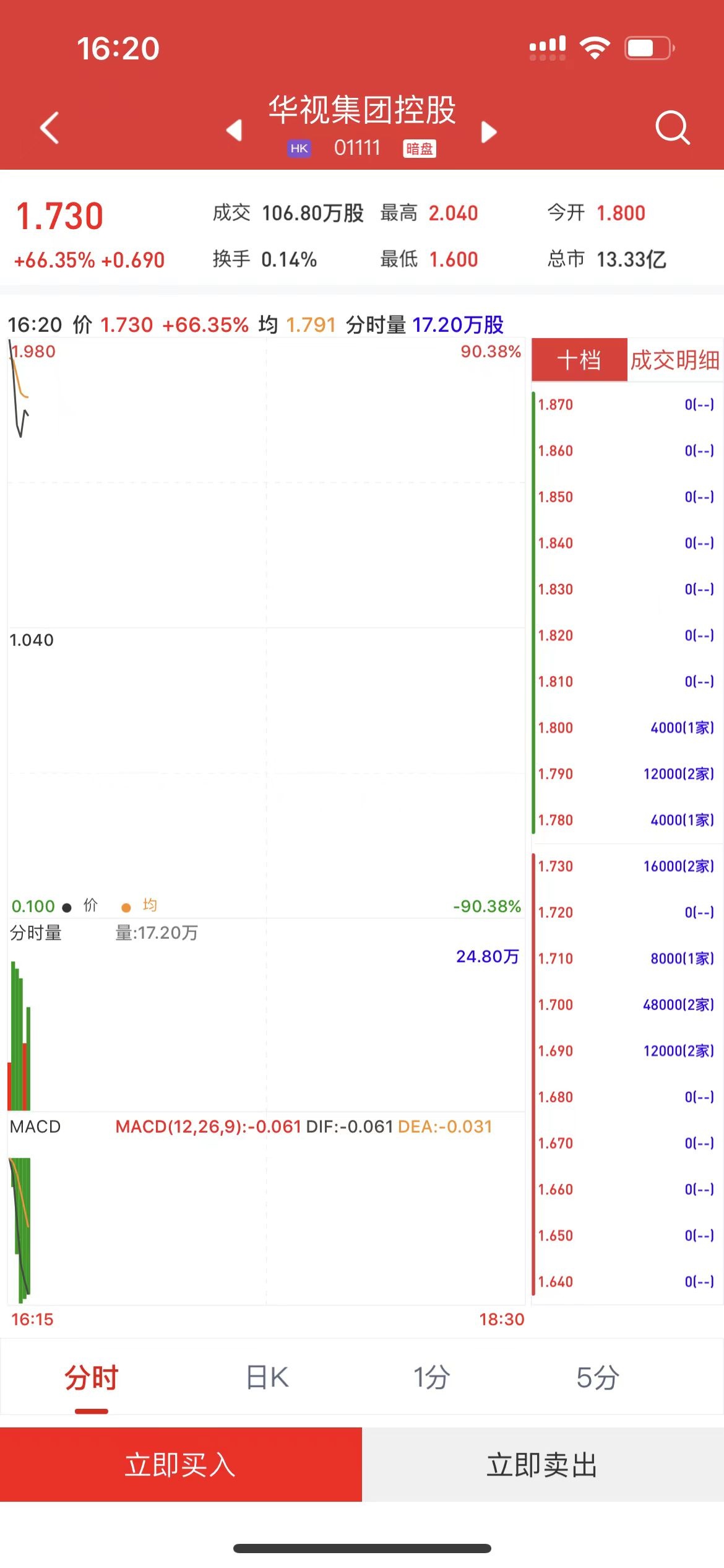 智通财经APP获悉,华视集团(01111)将于11月10日(周五)在香港挂牌。截至发稿,利弗莫尔证券暗盘交易显示报价1.73港元,较招股价1.04港元涨66.35%。每手4000股,不计手续费,每手赚2760港元。