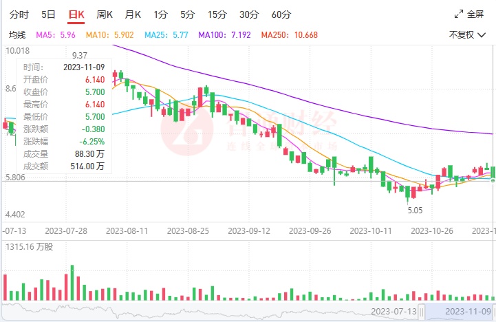 就在不久之前的10月19日,海伦司盘中触及5.05港元,刷新了上市两年多来的新低。虽然在此之后借着港股大盘回暖,海伦司的股价也有所反抽,但11月9日该股再次放出大阴线,收盘股价较历史新低也已相去不远。
