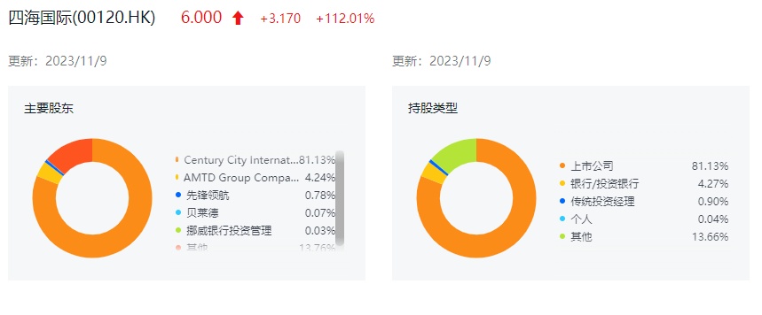 富途牛牛数据显示,四海国际第一大股东为Century City International Holdings Limited(以下简称:CCBVI),持股比例高达81.13%。据悉,CCBVI是世纪城市国际的全资附属公司。四海国际的第二大股东为AMTD Group Company Limited, Asset Management Arm,持股比例达4.24%。后者为亚洲最大的独立投资银行和领先的国际化综合企业集团,致力于服务和打通内地和香港两地及环球资本与资源。简言之,四海国际两大股东股权比例合计高达85%,股权高度集中,股价容易被操纵。