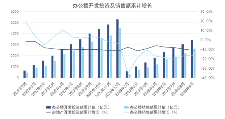 国家统计局数据显示,2023年1-8月,全国办公楼开发投资额累计3036亿元,同比下滑9.7%;办公楼销售额累计值2224亿元,同比下滑16.6%。整体来看,商办投资市场表现欠佳。
