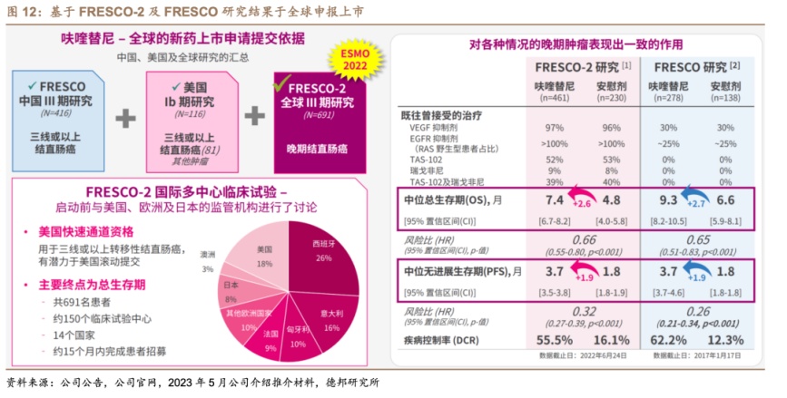 该研究在2021年12月提前完成患者入组,而后取得了积极结果,并于去年9月在ESMO年会上公布了数据,和黄医药也随即启动了呋喹替尼在美国新药上市申请的滚动提交并在今年11月9日顺利获批在美国上市。