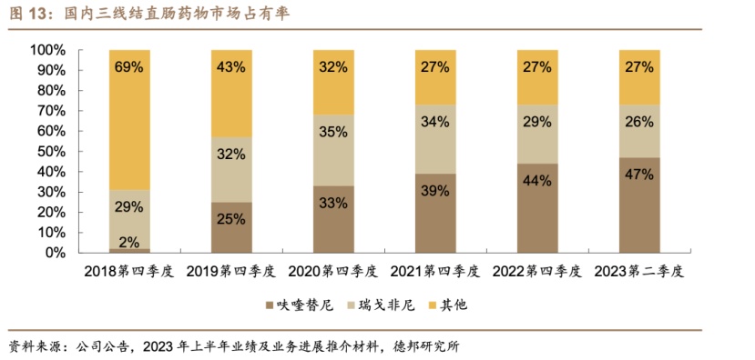 按市场此前的销售预期,呋喹替尼作为瑞戈非尼的me-better,有望复制瑞戈非尼的成功,甚至实现替代,从市占率看也的确如此。目前呋喹替尼在国内三线结直肠癌领域已占据近半成市占率。约17000名新患者接受治疗,这让呋喹替尼在国内三线结直肠癌的患者市场占有率处于领导地位。但更高的市占率却没能换来更高的销售增速,这一结果让呋喹替尼出海变得愈加迫切。