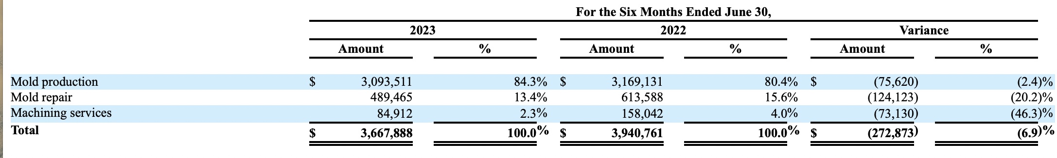 模具维修业务则是公司的第二大营收来源,为公司贡献了超13%的营收。今年上半年,在模具维修的订单量和总订单价值保持稳定的背景下,该业务的营收却出现了20.2%的大幅下滑。对此公司解释称,该业务收入减少的主要原因是收入确认延迟,一些交付的产品尚未收到客户的验收确认通知,这部分收入将在未来通过验收检查后确认。
