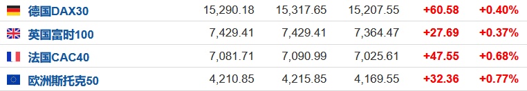 2.截至发稿,德国DAX指数涨0.40%,英国富时100指数涨0.37%,法国CAC40指数涨0.68%,欧洲斯托克50指数涨0.77%。