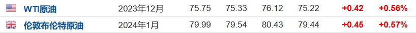 3. 截至发稿,WTI原油涨0.56%,报75.75美元/桶。布伦特原油涨0.57%,报79.99美元/桶。