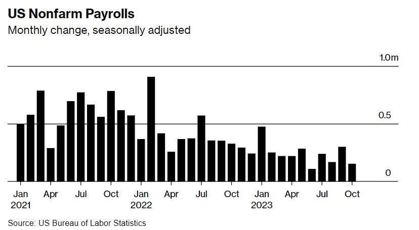 美国就业市场走软和消费者信心下滑的新迹象表明,处于22年高位的利率正开始产生影响。10月份就业增长放缓幅度超过预期,非农就业人数增加15万人,增幅约为上月的一半,失业率升至3.9%的近两年高点。月度工资增长放缓,这显然不值得美国家庭高兴。但这对美联储来说是个好消息,因为高于趋势水平的工资增速使降低通胀的任务变得复杂。