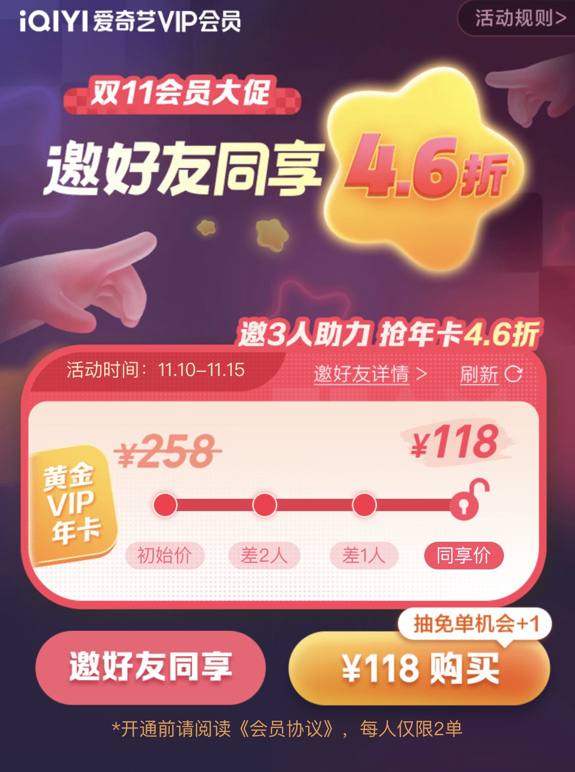 追剧的快乐当然要和朋友分享!购卡优惠也可以和朋友同享!今年双11,爱奇艺(IQ.US)上线会员互动购卡新玩法:11月10日至11月15日,爱奇艺用户可向好友发起助力邀请,3位好友接受邀请即为助力成功。助力发起人及参与好友均可享4.6折购卡超值特惠,原售258元/年的黄金VIP会员年卡,活动期间优惠至118元/年。每位用户有1次发起助力或为其他好友助力机会。参与活动的用户还可参与购后抽奖,有机会获赠免单资格、VIP会员天数、京东PLUS年卡、中免日上美力+臻选季卡等多种惊喜福利。(活动参与链接:https://iqiyi.cn/fhczl)