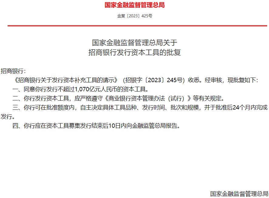 智通财经APP获悉,11月10日,国家金融监督管理总局发布关于招商银行(03968)发行资本工具的批复,批复同意招商银行发行不超过1070亿元人民币的资本工具,可在批准额度内,自主决定具体工具品种、发行时间、批次和规模,并于批准后24个月内完成发行,招商银行应在资本工具募集发行结束后10日内向金融监管总局报告。