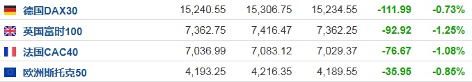 2.截至发稿,德国DAX指数跌0.73%,英国富时100指数跌1.25%,法国CAC40指数跌1.08%,欧洲斯托克50指数跌0.85%。