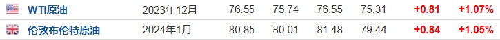 3. 截至发稿,WTI原油涨1.07%,报76.55美元/桶。布伦特原油涨1.05%,报80.85美元/桶。